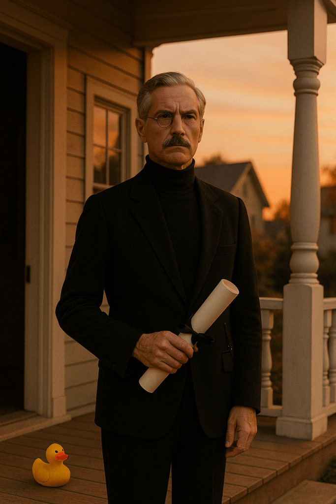 He carries a scroll tied with black ribbon, sealed with absurdity.